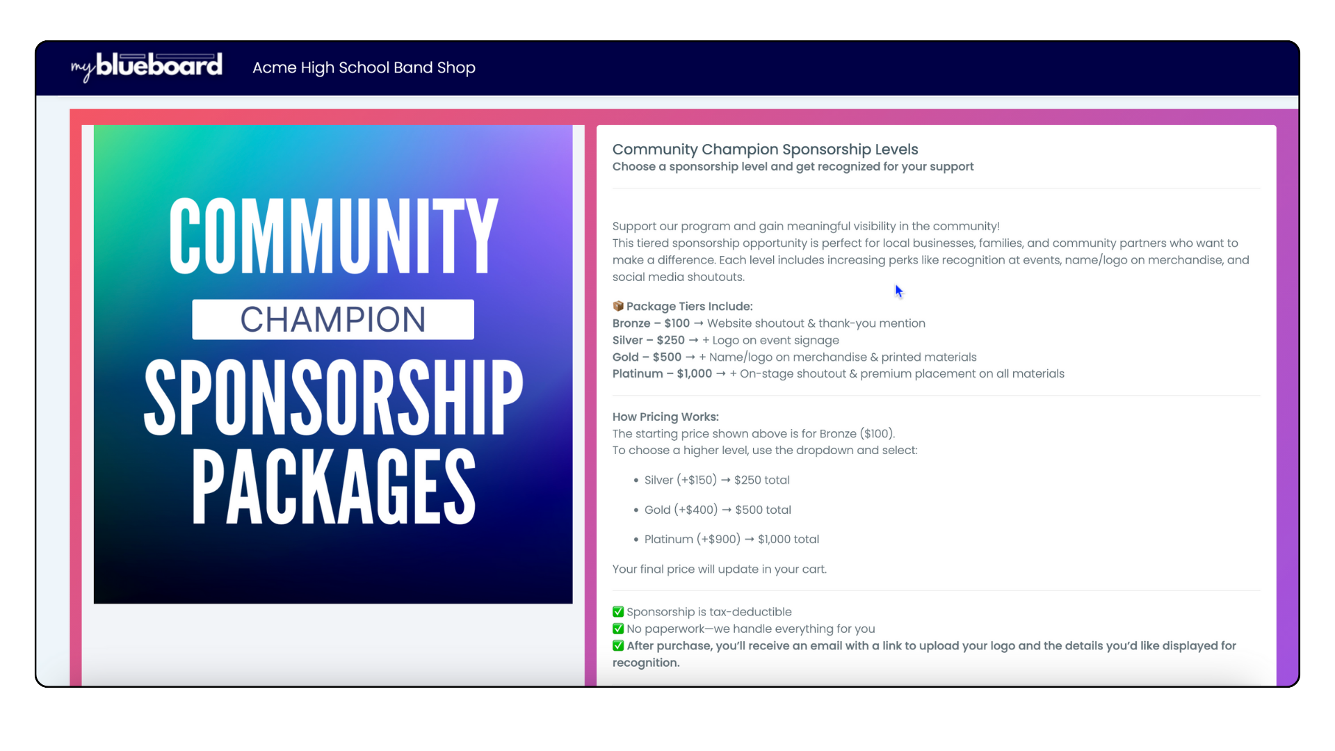 With myblueboard, launch a pop-up shop for any season—holidays, Valentine’s Day, Spirit Wear, or anything you choose. Offer merchandise, services, and event tickets your community will love.