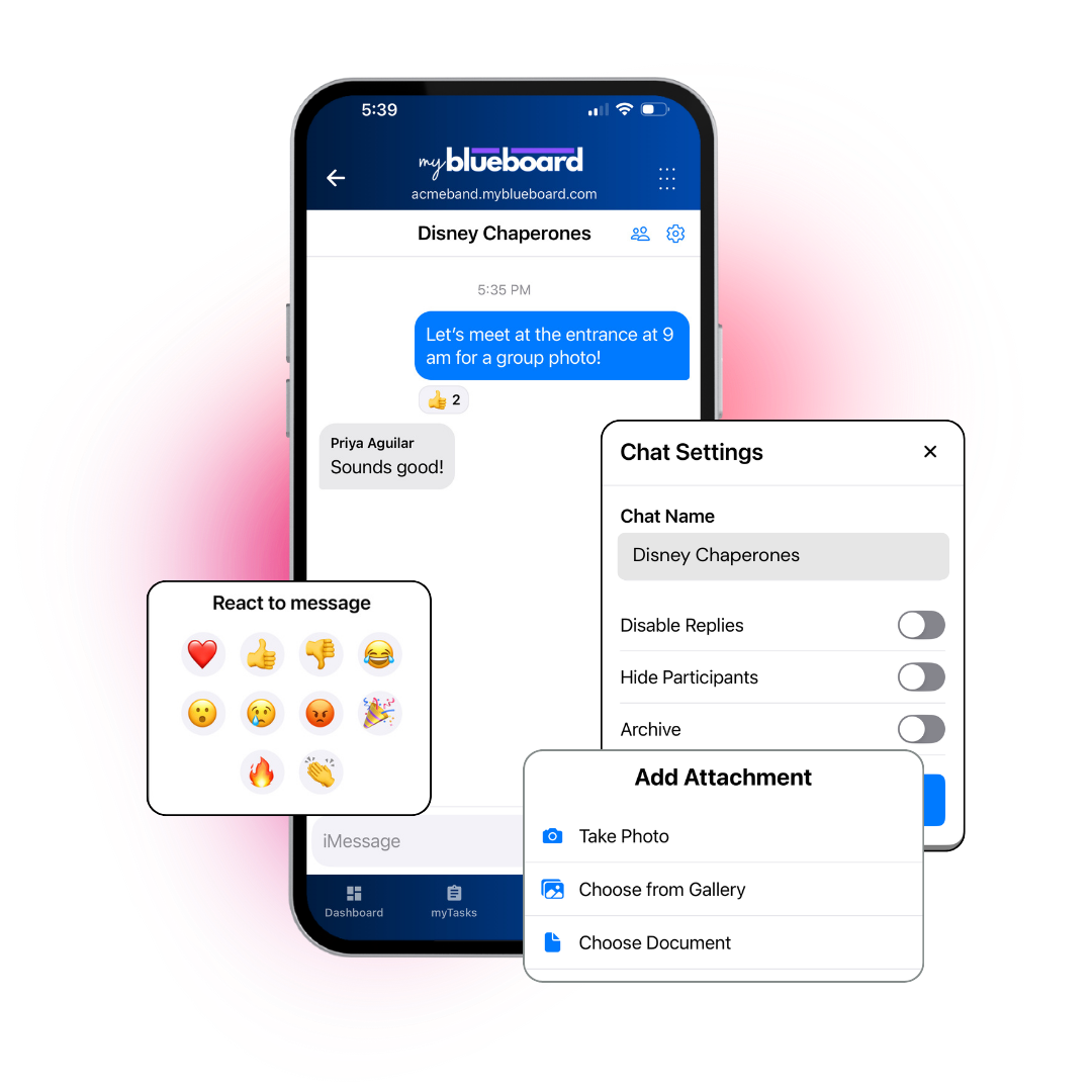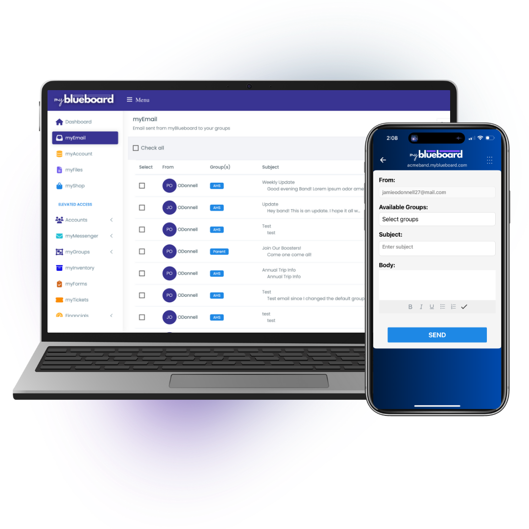 myblueboard replaces multiple apps with one shared platform. Admins set it up, invite everyone to join, and each user gets their own account and dashboard—keeping communication, payments, forms, events, and fundraising in one place.